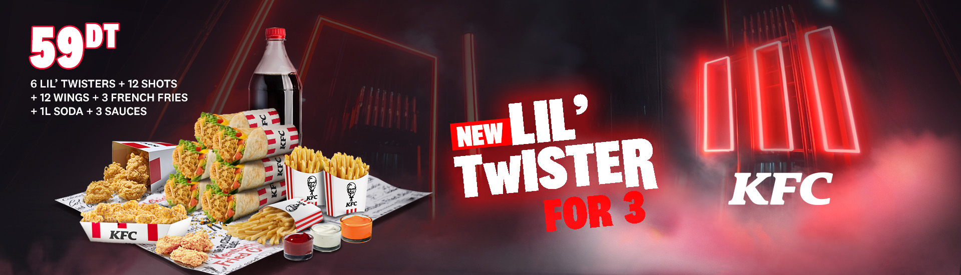 21,90 TNDTwister sandwich au choix, 1 moyenne frite, 1 pièce de poulet , canette au choix